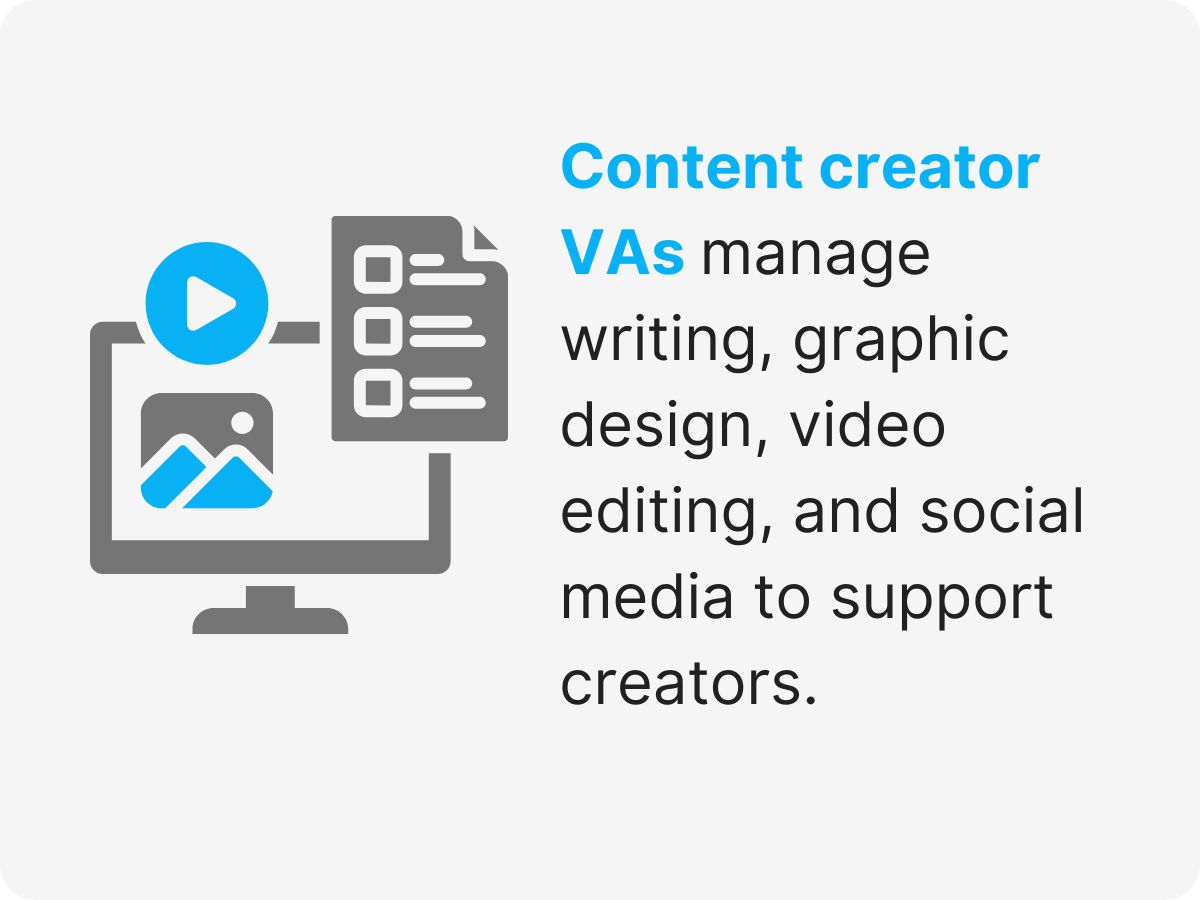 A content creator virtual assistant is a specialized virtual assistant for creator management who helps businesses and individuals with content creation needs, making them a great fit for companies that need virtual assistants.